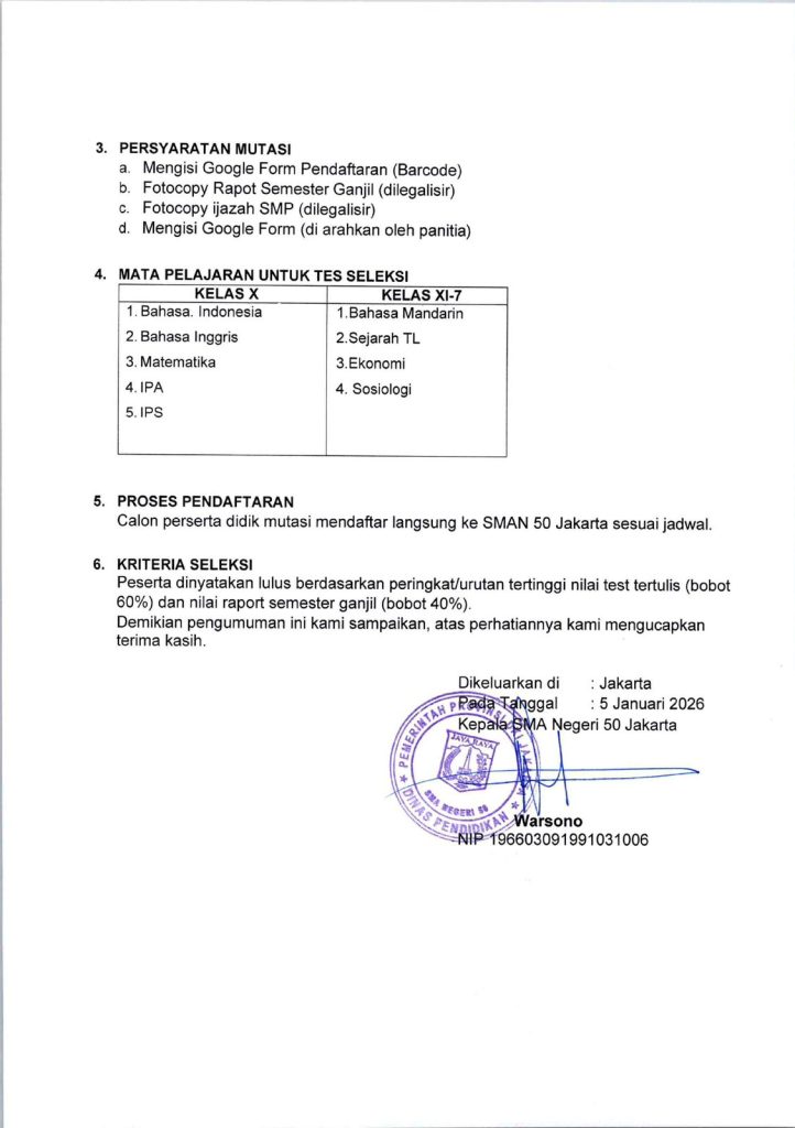Menindaklanjuti ketentuan dan kebijakan yang berlaku, dengan ini kami sampaikan informasi mengenai pelaksanaan mutasi peserta didik Semester Genap Tahun Pelajaran 2025/2026.